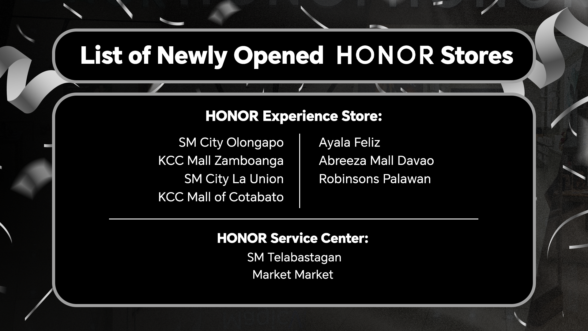The new HONOR Stores are located in SM City Olongapo, SM City Telabastagan, SM City La Union, KCC Mall of Zamboanga, KCC Mall of Cotabato, Ayala Malls Feliz, Abreeza Mall Davao, Robinsons Palawan, and Market! Market!