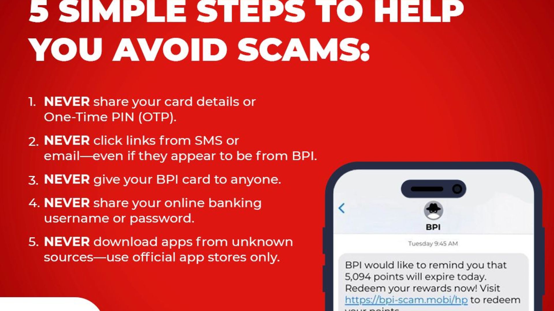 - NEVER click on links, whether via SMS or Email, even if the sender is BPI.