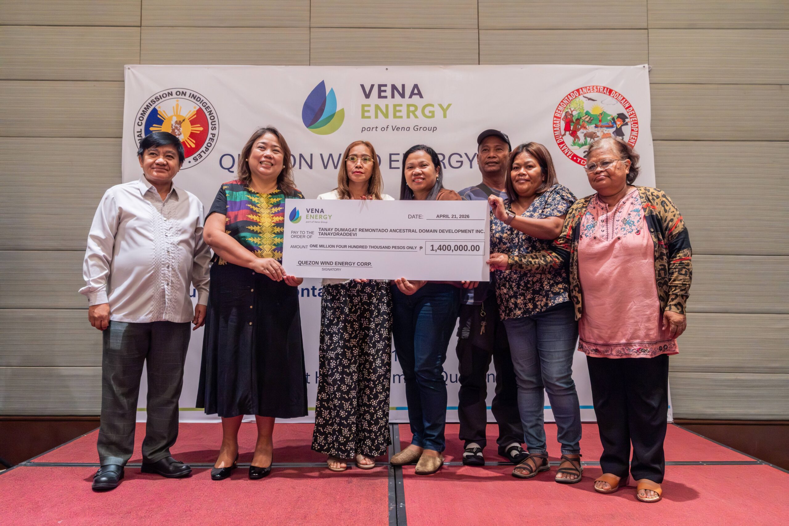 Quezon Wind Energy Corp. (QWEC), a subsidiary of Vena Energy, a leading green energy solutions provider across the Asia-Pacific region, marked a key milestone in its community engagement efforts through a check turnover ceremony for its host community, the Dumagat/Remontado Indigenous Cultural Communities (ICCs) of Tanay. The ceremony was held in Quezon City on 21 April 2026.